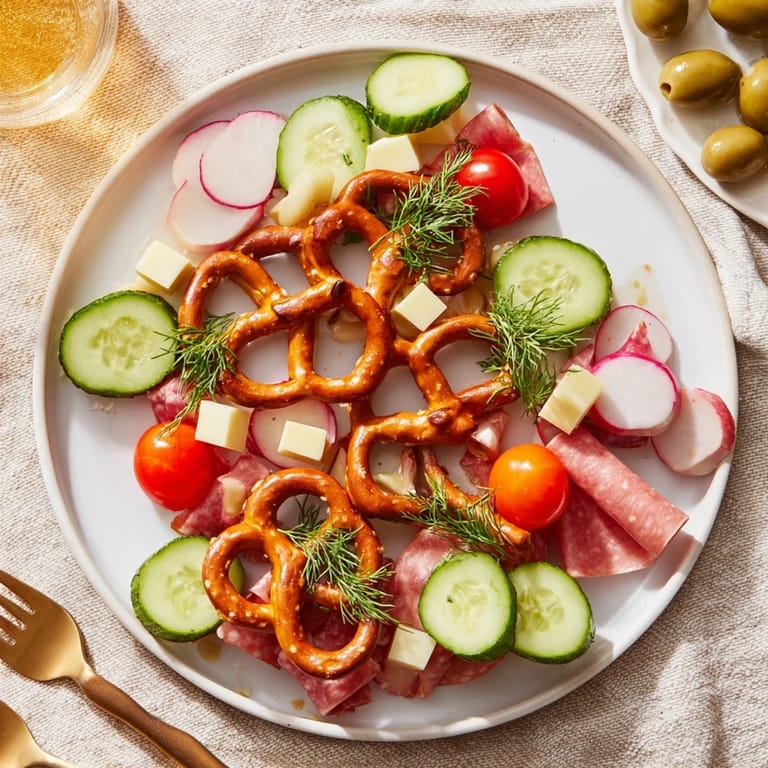 - Artfully arrange cheese, cured meats (if using), vegetables, olives, and radishes among and around the pretzels to create a lush, colorful tree effect. Garnish with fresh herbs.