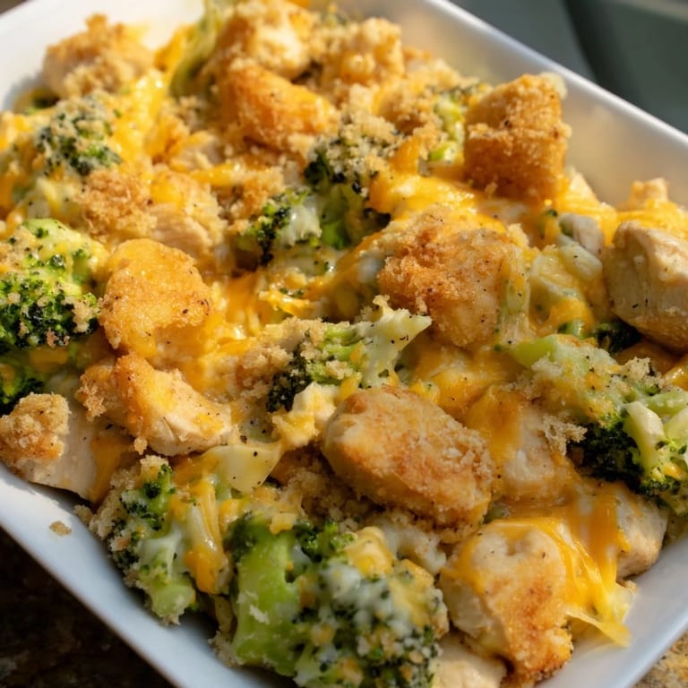 Save A comforting, cheesy casserole featuring tender chicken, crisp broccoli, and a golden cheddar topping—perfect for a cozy family dinner.