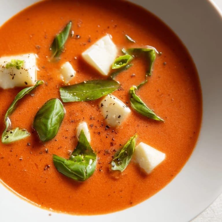 - Pour in the heavy cream, add the diced mozzarella and torn basil, then return the pot to low heat. Stir gently for 3 to 4 minutes until the mozzarella melts into creamy swirls and the soup looks glossy and irresistible.