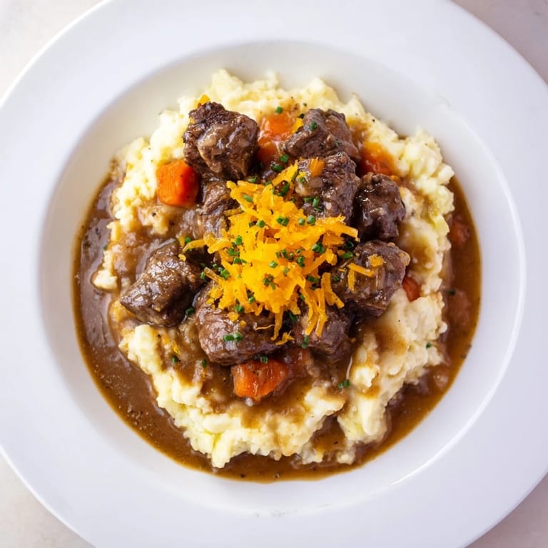 Save A cozy autumn dish featuring cider-braised beef stew served over creamy cheddar mashed potatoes with fresh chives comfort food perfect for chilly evenings.