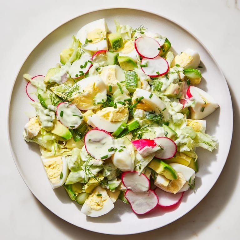 Cucumber, radishes, celery, and chives provide crisp textures that balance the creamy dressing and soft eggs beautifully.