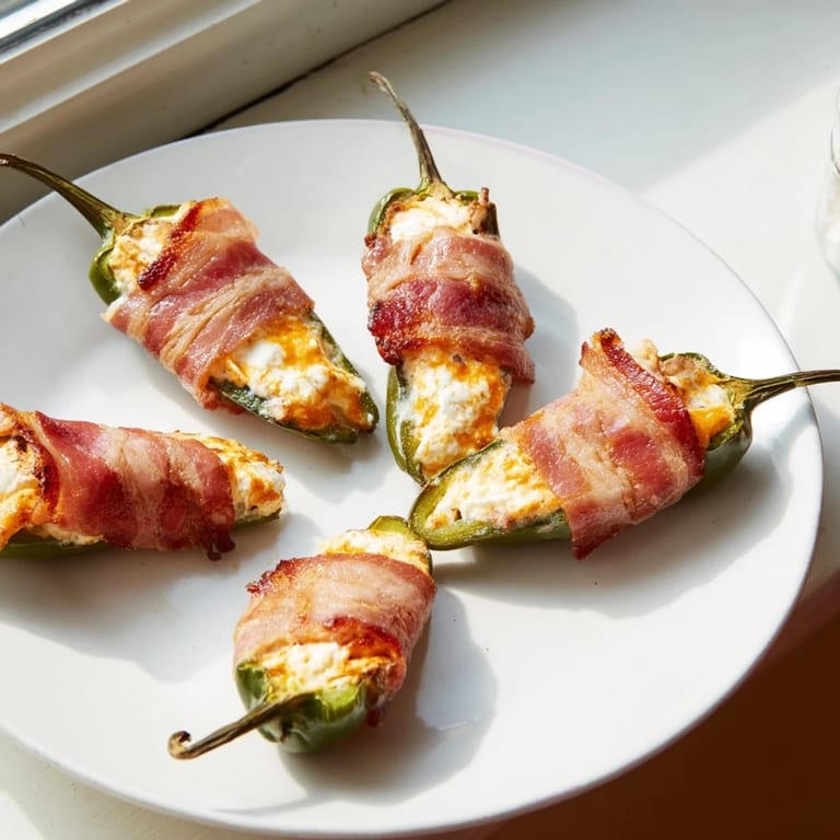 Save A festive, spicy appetizer featuring jalapeños stuffed with creamy cheese, wrapped in crispy bacon perfect for holiday gatherings.
