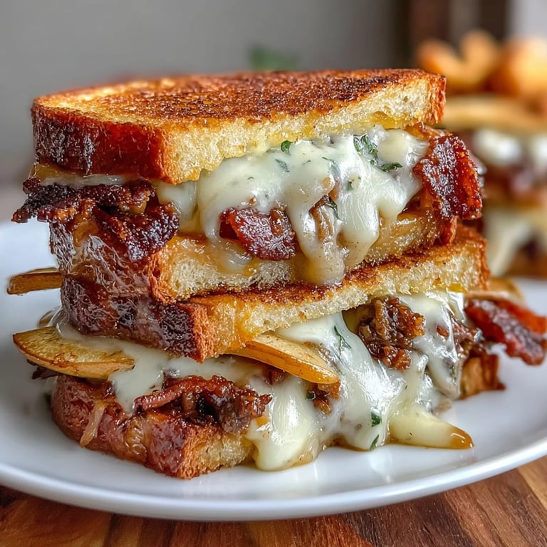 This savory comfort features crisp artisan bread enveloping melted sharp cheddar, smoky beef bacon, and fresh apple slices. A drizzle of spicy hot honey delivers a sweet heat that perfectly balances flavors and textures. Cooked slowly on a skillet until golden and melty, it offers a rich, harmonious fusion of smoky, sweet, and tangy notes ideal for a cozy meal.