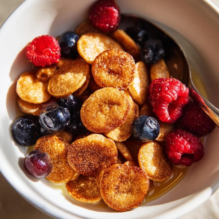 Save Adorable, bite-sized pancakes served like breakfast cereal, crispy on the outside, fluffy inside, and perfect with milk, syrup, or fruit. Enjoy them for a fun breakfast that brings smiles to everyone at the table.