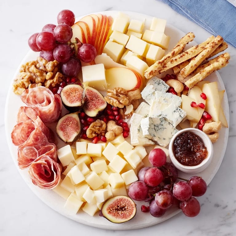 - Cheeses: 150 g Brie, sliced 150 g Comté, cubed 120 g Roquefort, crumbled 100 g Chèvre (goat cheese), sliced