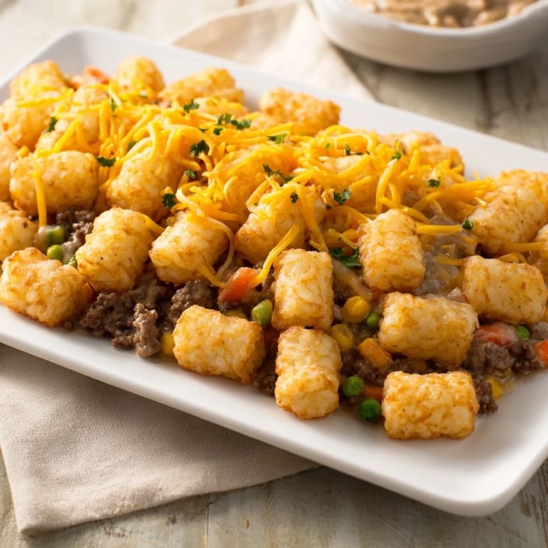 Save A festive and comforting casserole featuring crispy tater tots, savory ground beef, and creamy vegetables—perfect for a quick holiday meal.
