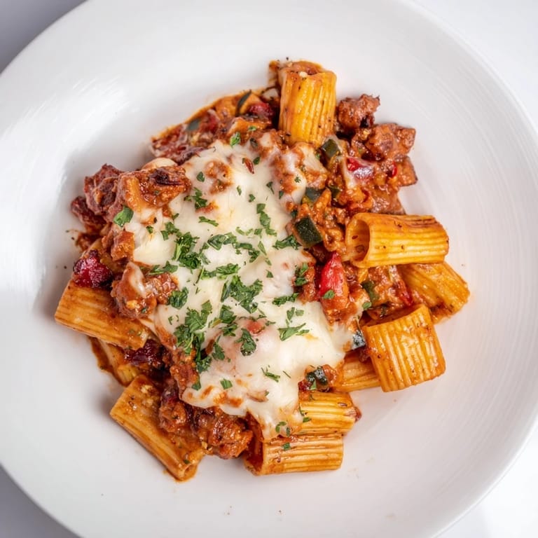 Save A hearty, flavor-packed pasta bake featuring spicy vegan chorizo, roasted vegetables, and a creamy tomato sauce, perfect for a comforting plant-based meal.