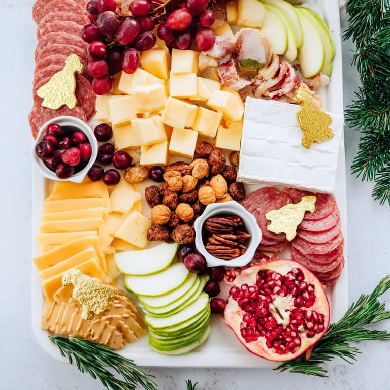 This snack board is not only visually stunning but also versatile. Layered with a variety of textures and flavors, it invites guests to sample and share, while the festive decorations like edible gold leaf and rosemary sprigs add a seasonal charm that brightens any table.