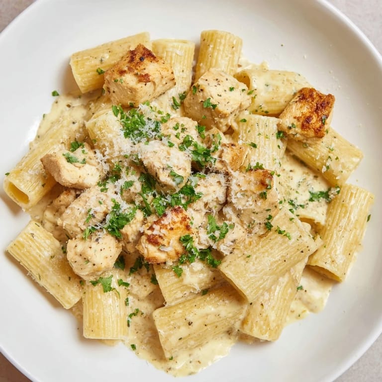 Save A comforting pasta dish featuring tender chicken, a rich garlic-Parmesan cream sauce, and perfectly cooked rigatoni. Ideal for a cozy weeknight meal or entertaining guests.
