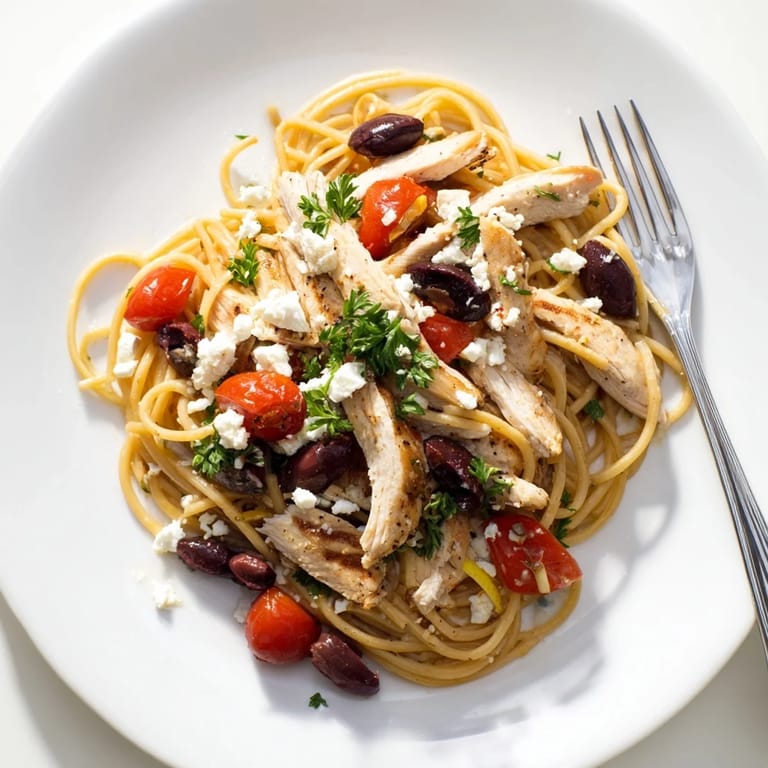 Save Summer evenings on the balcony taught me that pasta doesn't always need a heavy sauce. One August, I threw together grilled chicken with whatever I had from the market, cherry tomatoes, feta, olives, and it became the kind of meal I craved every week after. The lemon juice hit the warm noodles and everything just woke up. No fuss, no long simmering, just bright flavors that tasted like vacation even on a Tuesday.
